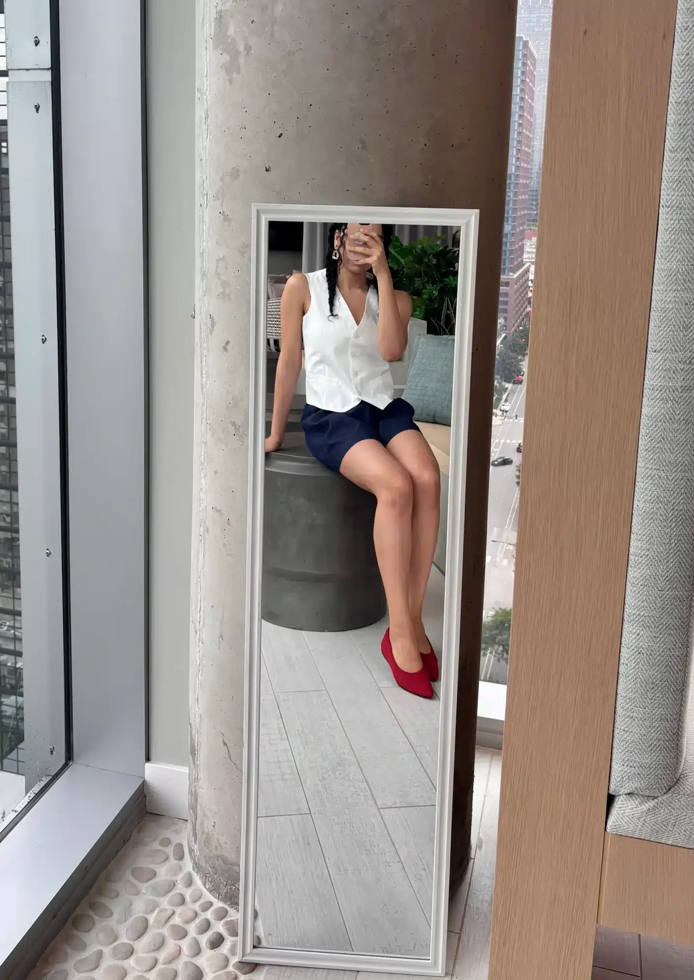 Petite Styling Idea: A slim-fit vest is a more elevated alternative to a T-shirt. Here, I’m pairing the Petite Studio Bridgett Vest with their Anne Denim Shorts. The shorts have a high waist (visually lengthening the leg line) and a comfortable, slightly wider leg opening, for a relaxed structure to contrast the fitted vest.